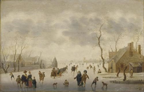 | A WINTER LANDSCAPE WITH ELEGANT FIGURES SKATING AND A COUPLE IN A HORSE-DRAWN SLEIGH ON THE ICE | |