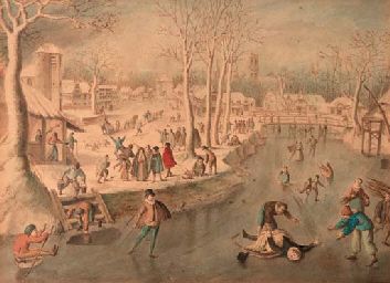 | Scaters and other figures on frozen water, a village in the distance | |