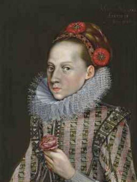 | Portrait of a girl, half-length, in a richly embroidered red dress and a ruff, with a decorated headband, holding a rose | |