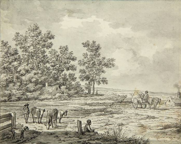| Landscape with an angler, a farmer with three cows and a horsedrawn cart | |