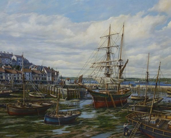 | A harbour scene at low tide with sailing boats and dinghies on the mud flats and white wash buildings on the quayside | |