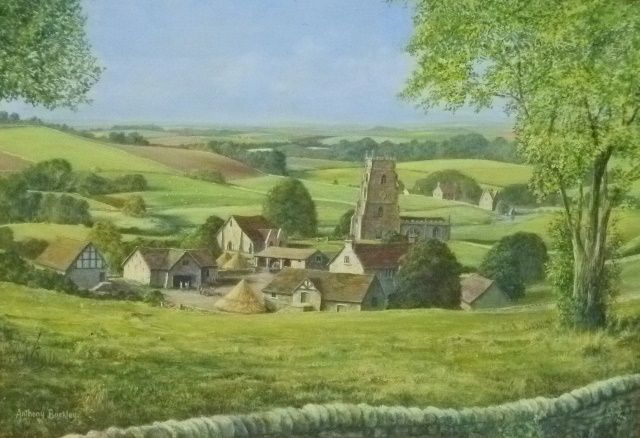 An English Village in the lea of a hill with dry stone wall in foreground