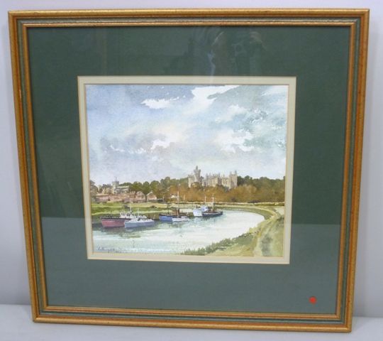 Arundel from the river, a view with moored fishing vessels and the castle in the background