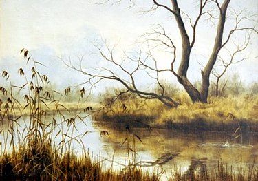 Tree lined river landscape with reeds to the fore
