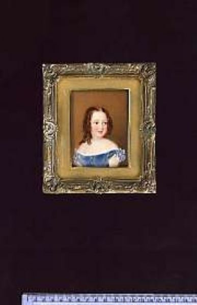 | A young child, wearing blue dress with silver buttons, lace trim and blue and white bows on the sleeves | |