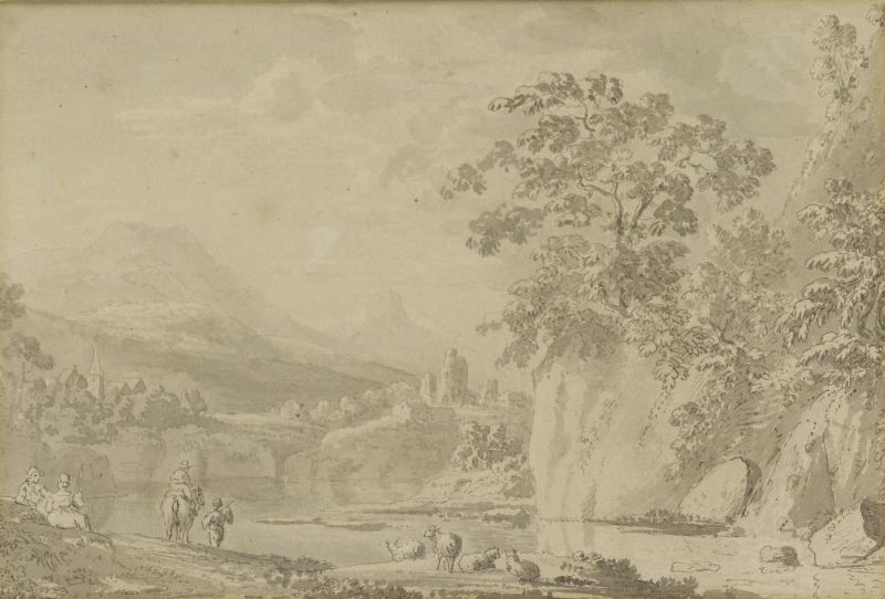 | TRAVELLERS AND RUSTICS AND THEIR ANIMALS IN A WOODED HILLY LANDSCAPE | |