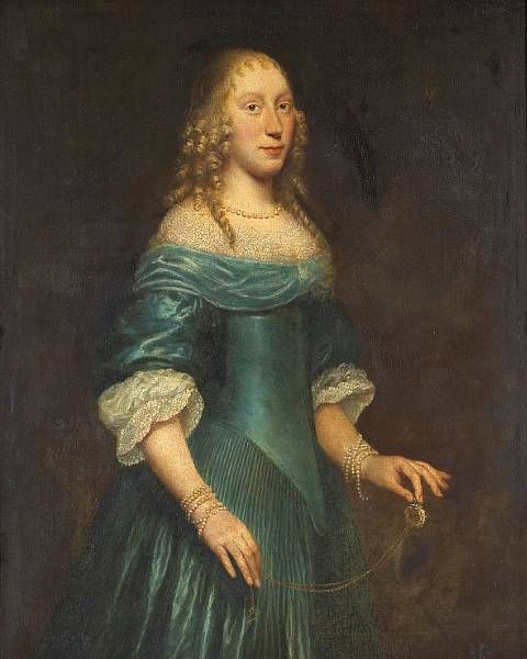 | A portrait of a lady, three-quarter length, standing, wearing a blue gown and holding a watch | |