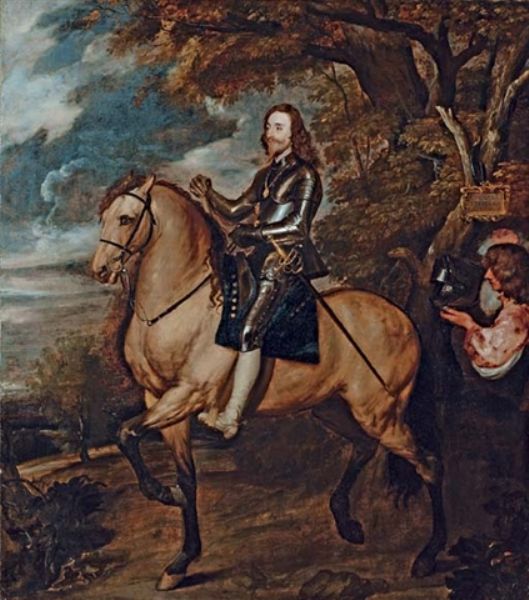 | Equestrian portrait of King Charles I, full-length, in armour on a dun horse, a baton in his right hand, wearing the Order of th | |