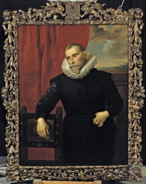 | Portrait of a gentleman, three-quarter length, in a black costume with a white collar, leaning on a chair before a red curtain | |