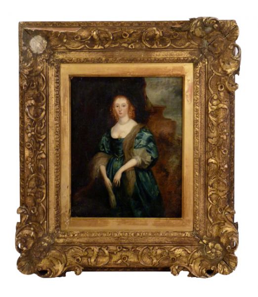 | PORTRAIT OF A LADY, THREE-QUARTER LENGTH, IN A BLUE DRESS AND HOLDING GLOVES | |