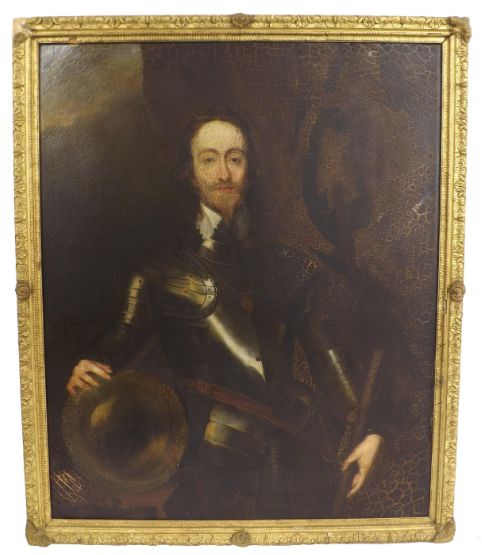 | Portrait of Charles I, standing three-quarter length, wearing armour, his right hand holding a helmet and his left hand resting | |