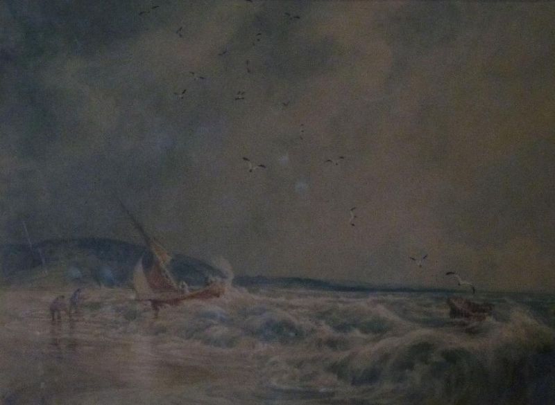 | Beach scene with fishing boat coming ashore in a rough sea | |