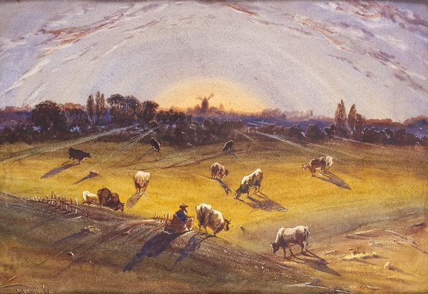 VACHES AU PATURAGE ET MOULIN AU SOLEIL COUCHANT