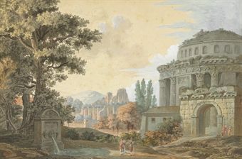 | Classical buildings with figures by a fountain | |