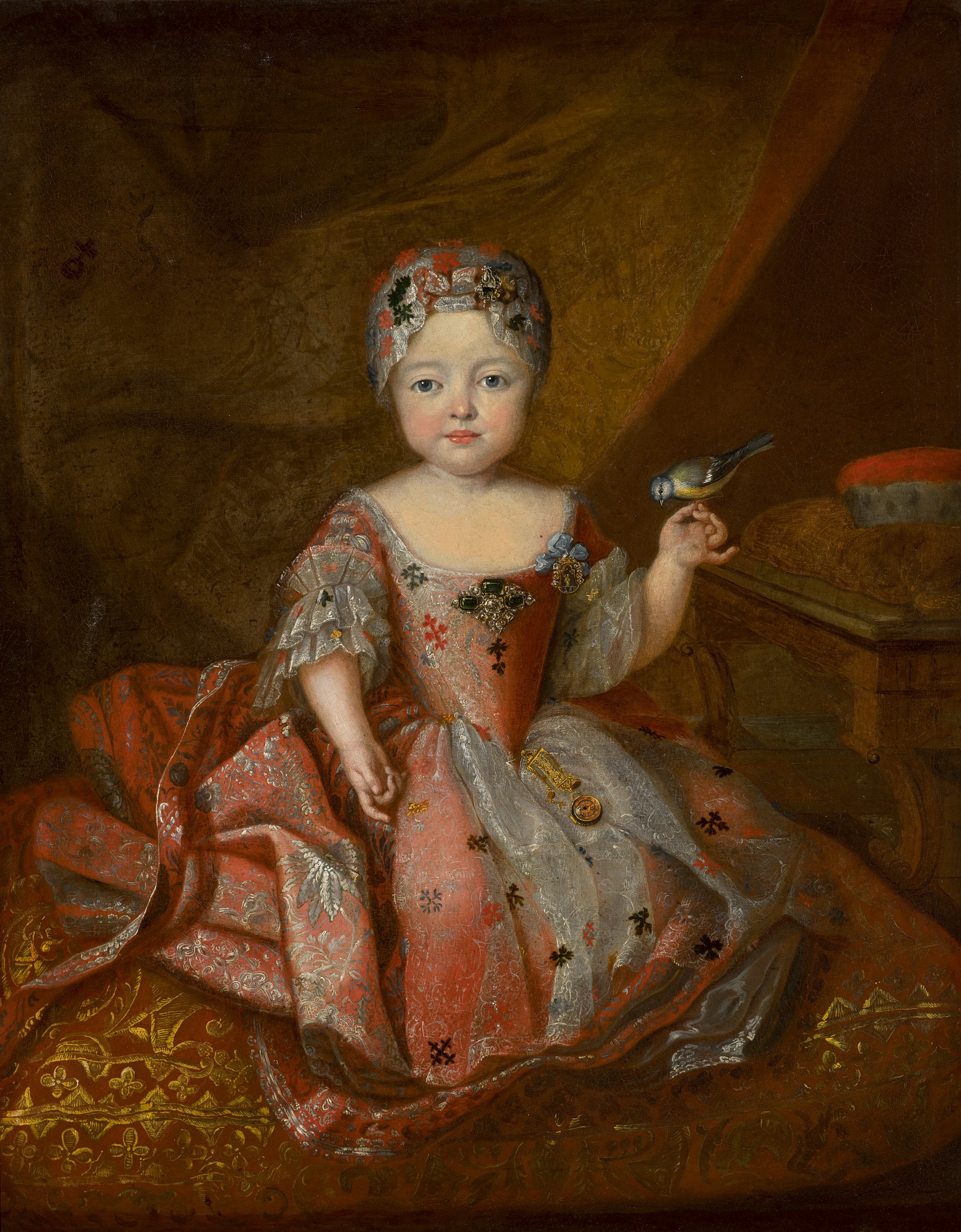 | PORTRAIT OF A GIRL, FULL-LENGTH, WEARING A PINK EMBROIDERED DRESS, HOLDING A SONGBIRD | |