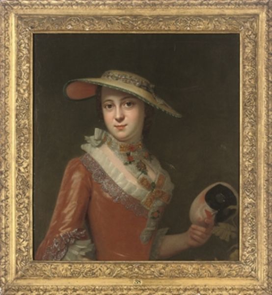 Portrait of a lady, half-length, in a red embroidered dress, and a straw hat, a mask in her left hand