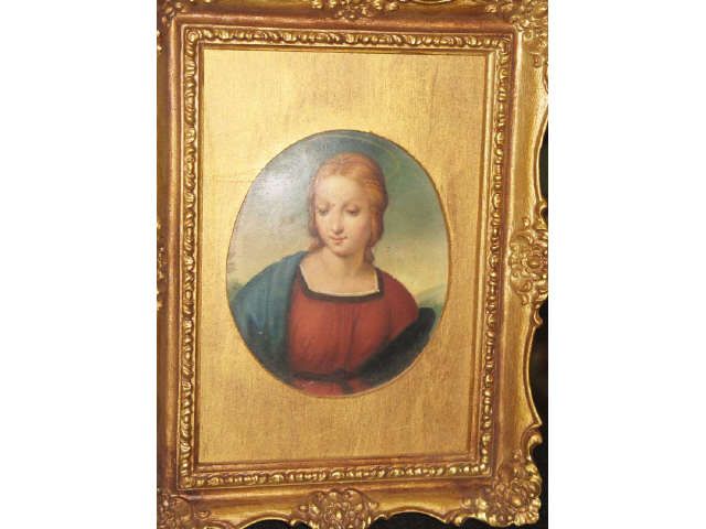 | a Young Woman of the 15th or 16th C, in the oval, wearing a red dress & a blue stole | |