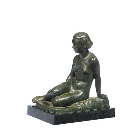 | A bronze figure group of a young woman seated with her legs under her and leaning on her left arm, on a naturalistic base upon a | |