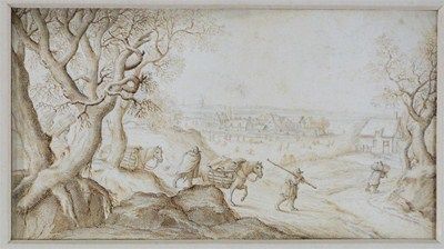 A Flemish landscape with travellers, mules and a village beyond