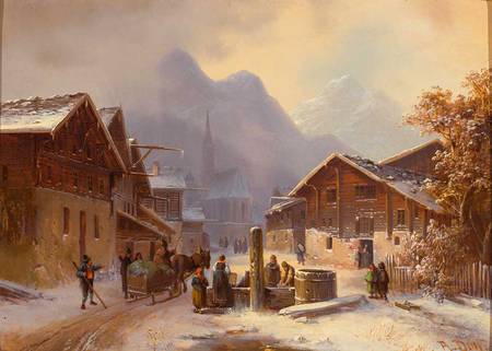 | Winter landscape in the Alps with Kirchdorf and numerous people in front of an outstanding massif. In a typical mastery style | |