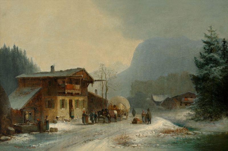 | Winterliche Berglandschaft mit alter Straße und lebhaftem Treiben vor einem Gutshof. | |