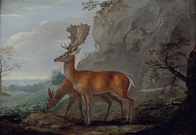 Damhirsch und Hirschkuh in Landschaft