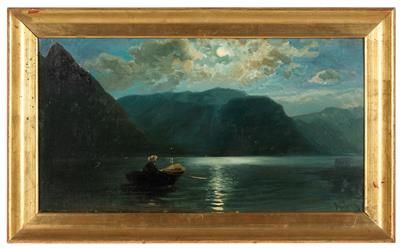 Landschaft mit See und Ruderboot im Mondschein, im Salzkammergut