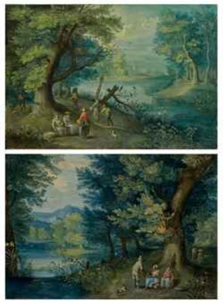 | Personnages se promenant au bord d'une rivière; et Personnages discutant dans un paysage de rivière | |