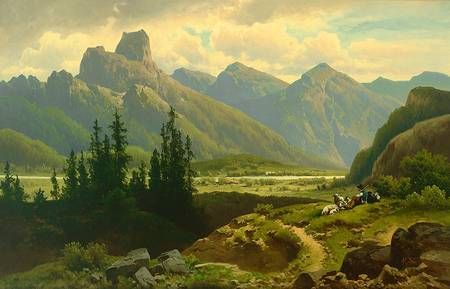 | Malerische Flusslandschaft in den Alpen mit Gebirgspanorama; Schäfer mit ruhender Herde auf besonnter Wiese | |