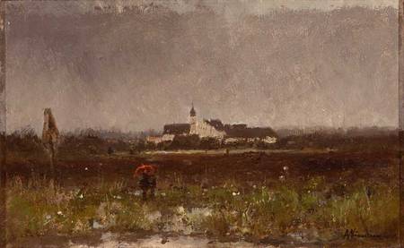 | Label of the gallery Heinemann Munich. Under a red umbrella walking couple. Laterally Marterl, in the background Kirchdorf | |