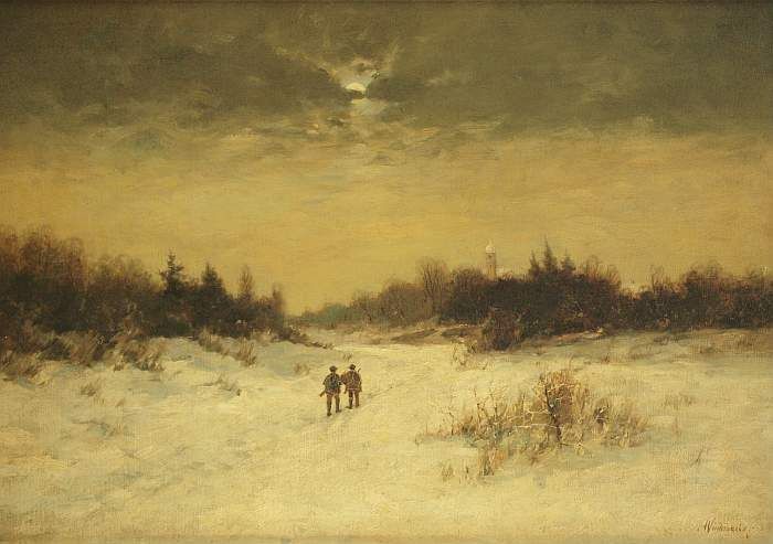 Zwei Jäger in Winterlandschaft auf dem Heimweg