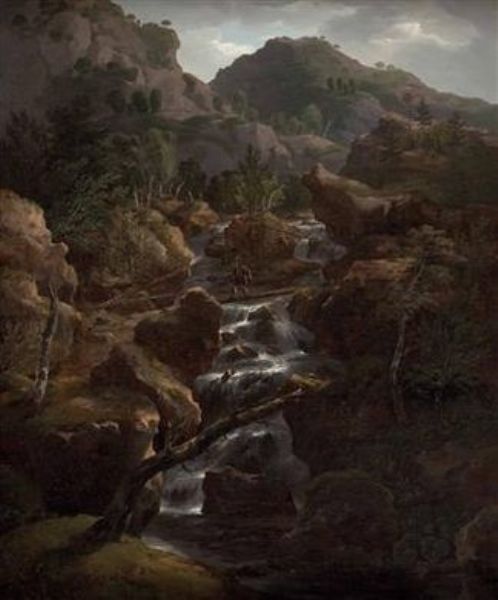 Gebirgskulisse mit einem Jäger, der über einen reißenden Bach geht