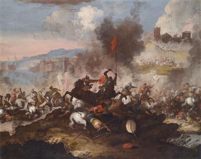| A battle between Christian and Turkish horsemen below the walls of a fortified city | |