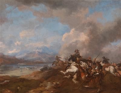 | A cavalry engagement against the backdrop of a mountain landscape | |