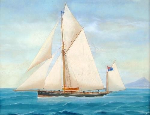 | A British gaff-rigged fishing vessel of the Naples coast, with Mount Vesuvius in the distance | |