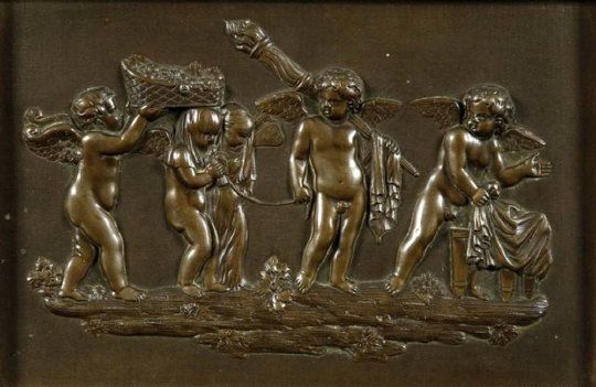 | A bronze relief Panel depicting a Classical Scene with five cherubs offering a basket of fruit | |