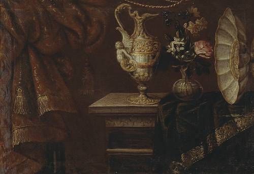 | A still life with an ewer, footed basin and flowers in a glass vase on a partially draped table | |