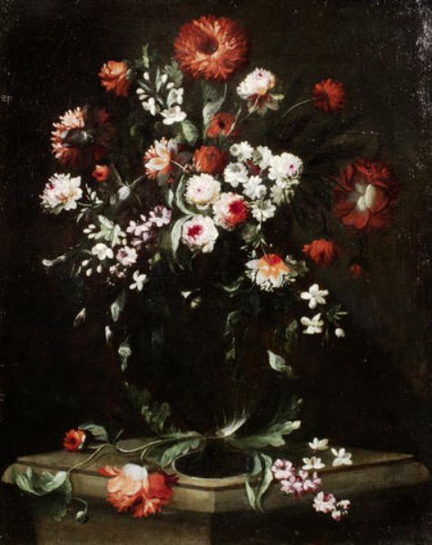 Roses, carnations and other flowers in a glass vase on a stone ledge