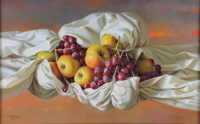 Still life study of apples and grapes enclosed in a sheet