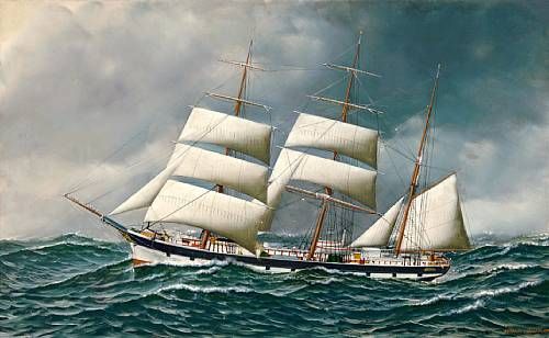 | The Norwegian bark Friedig at sea under reduced sail | |