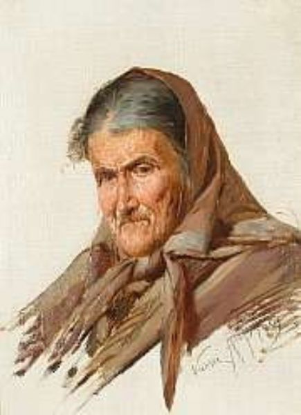A study of an elderly lady wearing a head scarf