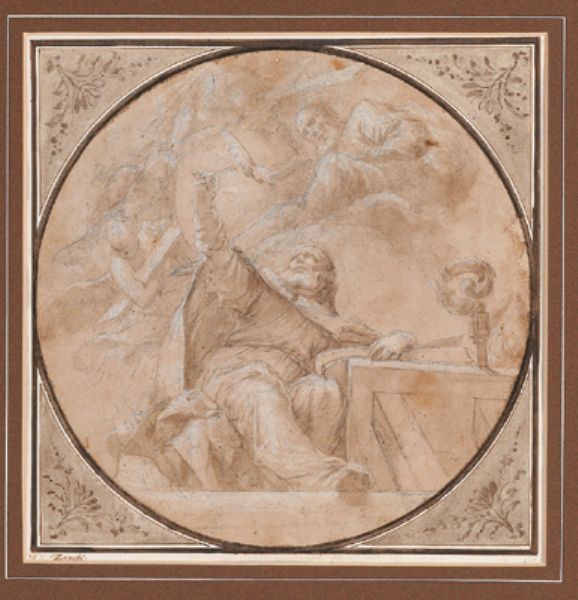 | A bishop with a crook, an open book and the dove, angels above him, design for a circular ceiling | |