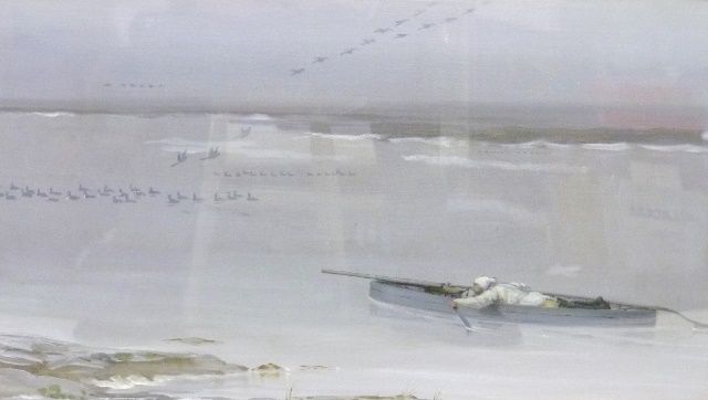 | Duck Shooting, a figure lying low in a punt aiming a fowling piece at a flock | |