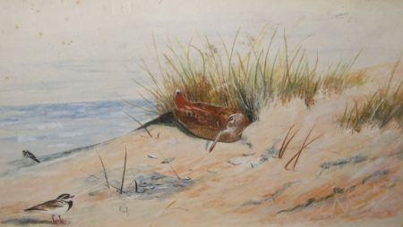 Woodcock and Turnstone in Sand Dunes with Coast Beyond