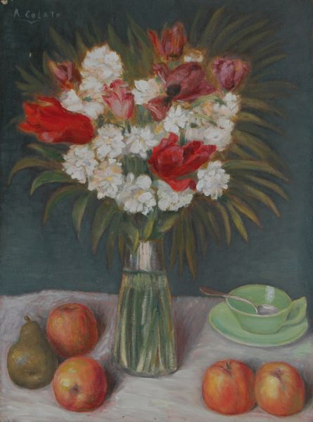 Natura morta con vaso di fiori, frutta e tazza da tè