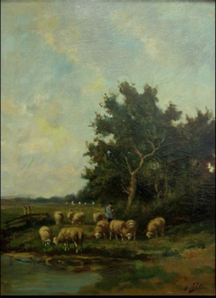 SHEPHERD AND FLOCK BY POND