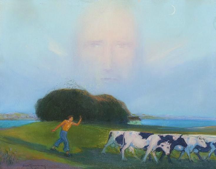 | A pantheistic scenery with shepherd with his cattle and God in the sky | |
