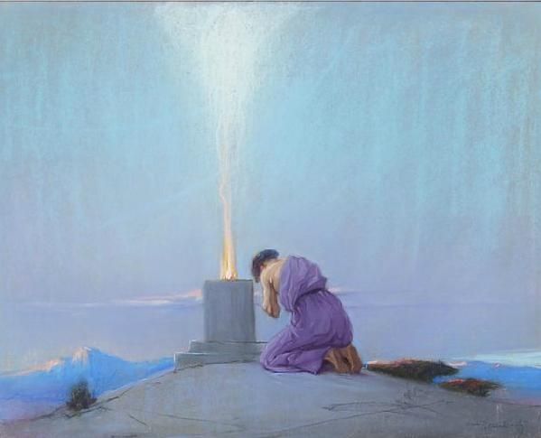 | Religious scene with a man, praying at a fire on a mountain | |