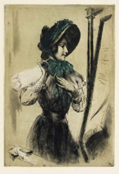 Jeune femme nouant le ruban de son chapeau.