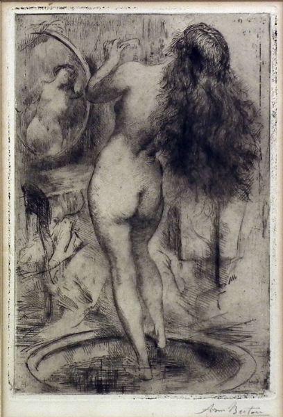 Nude woman before a mirror and a semi-clad woman lacing her boot